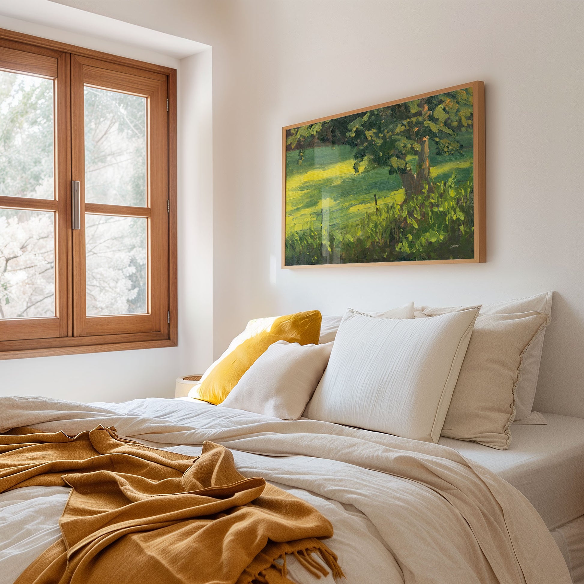 "Early Morning Pasture" by Carson Overstreet is an exquisite example of contemporary impressionist landscape art. This piece vividly captures the serenity and subtle dynamism of a pastoral scene bathed in the light of early morning. The composition is dominated by lush greens and soft yellows, conveying the freshness of the dawn and the gentle emergence of light over a tranquil pasture. The brushwork is expressive and vigorous, a hallmark of the impressionist tradition that favors an emotional rendition of reality over precise detail. This technique evokes the sensation of a gentle breeze rustling through the leaves and grass, imbuing the scene with life and movement. The interplay of light and shadow across the canvas creates depth and dimension, inviting the viewer to immerse themselves in the idyllic landscape. A solitary tree stands prominently in the foreground, its branches extending across the canvas. The use of light is masterful; the diffused sunlight filtering through the foliage highlights the texture of the leaves and the subtle undulations of the grassy terrain. The emphasis on natural elements reveals a contemplative intimacy with the landscape. This artwork is classified as impressionistic landscape painting, characterized by a focus on capturing the ephemeral qualities of light and atmosphere. "Early Morning Pasture" embodies the essence of its genre, offering a glimpse into the tranquil beauty of nature through the artist's skilled interpretation. This reproduction print allows admirers to experience the soothing harmony of Overstreet's pastoral vision in their own space.For more art by Carson Overstreet click here.