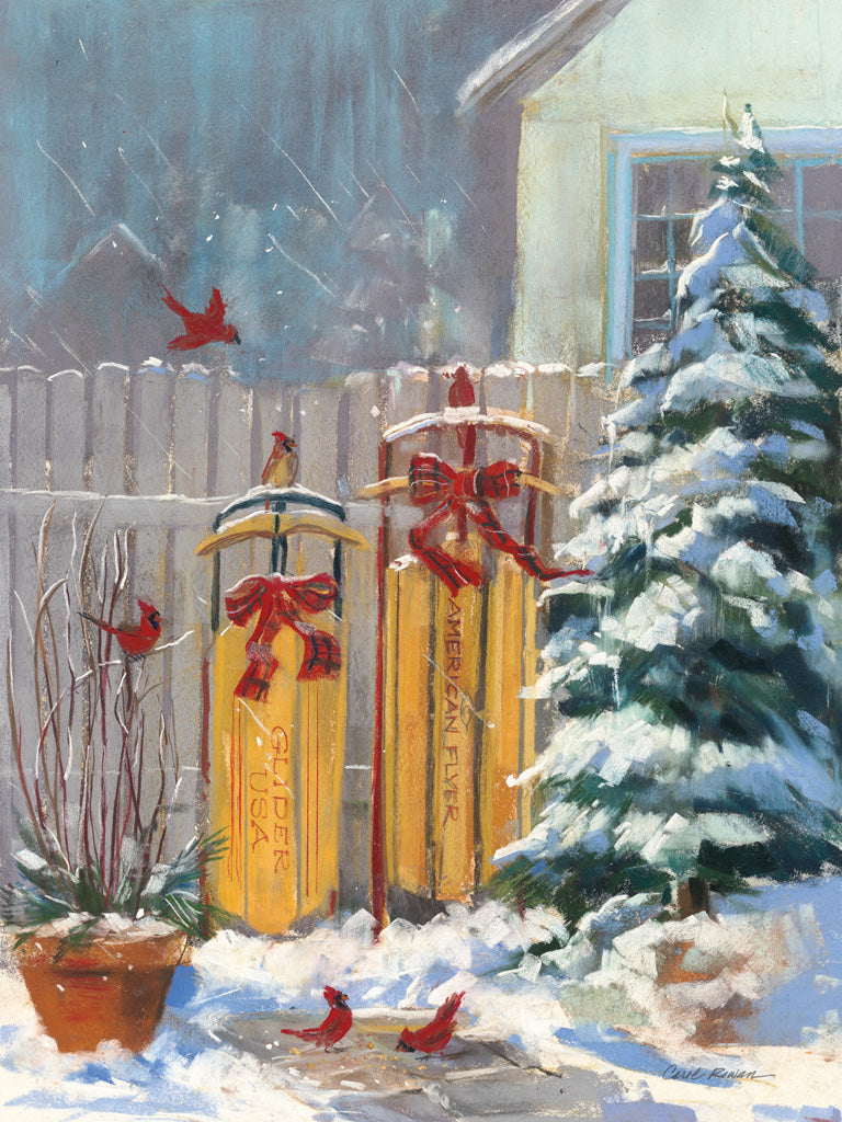 Transform your living space with the serene beauty of winter with our exclusive art print, a must-have addition to any wall decor collection. This captivating piece showcases a charming scene set against a backdrop of gently falling snow, offering a window into a tranquil winter wonderland. The foreground features three vintage sleds, each adorned with festive red bows, leaning against a classic white picket fence, evoking nostalgic memories of playful snow days. A lush evergreen tree, blanketed in a soft layer of snow, stands proudly beside the sleds, providing a contrast to the warm yellow tones of the wooden sleds with its cool, verdant hues. A trio of vibrant red cardinals delicately perches and flutters around this idyllic setting, their rich color popping against the muted tones of the winter landscape and adding a touch of natural elegance to the scene. The careful placement of these lively birds creates a dynamic sense of movement and life within the stillness of the snowy day. A snow-covered evergreen potted plant adds a touch of greenery, suggesting the resilience of nature amidst the chill of winter. Crafted with exquisite detail and color depth, this art print is a celebration of the season's simple joys and the heartfelt warmth that comes from cherished winter traditions. Ideal for hanging in your living room, bedroom, or office, it brings a cozy, seasonal touch to any interior design. Whether you're looking to enhance your holiday decor or simply want to enjoy the peaceful essence of winter all yearFor more art by Carol Rowan click here.