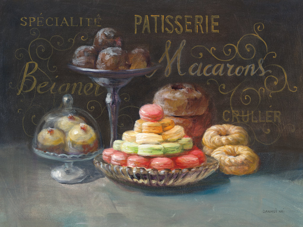 The art piece "Reproduction of Patisserie" by Danhui Nai is a captivating and evocative work that elegantly captures the timeless charm and delectable allure of a traditional French pastry shop. Nai's exceptional use of still life composition, paired with delicate brushwork and a rich, sumptuous color palette, creates an image that is both inviting and serene. At the heart of the piece, a tiered assortment of vividly colored macarons takes center stage. The macarons, meticulously rendered in shades of pastel greens, yellows, and pinks, are stacked in a pyramid, embodying both visual delight and culinary sophistication. Surrounding this central display, the artist has skillfully portrayed an array of classic patisserie offerings: puff pastries under a delicate glass cloche, powdered beignets heaped high on an elegant pedestal, and golden, twisted crullers invitingly arranged on the right. This arrangement celebrates the intricate artistry and sweet decadence inherent in French baking. The background, a dark, slightly textured surface, provides a dramatic contrast that enhances the vibrant hues of the confections. Subtle gold lettering and flourishes in the background bring a sense of authenticity and nostalgia, evoking the elegant signage of a vintage patisserie. Words like "Spécialité," "Macarons," "Beignet," and "Cruller" are inscribed with an ornate cursive script, seamlessly blending into the composition while guiding the viewer's eye through the piece. Danhui Nai’s artwork isFor more art by Danhui Nai click here.