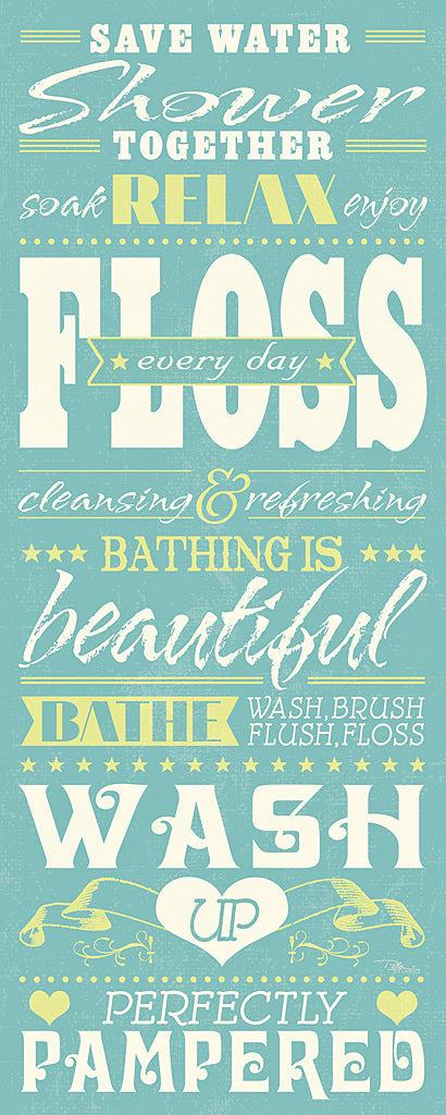 Elevate your bathroom ambiance with our vintage-inspired typographic art print, ideal for adding a splash of charm to your wall decor. This unique piece features a delightful array of soothing phrases such as "Save Water Shower Together," "Relax," "Floss," and "Perfectly Pampered" set against a serene backdrop that blends subtle shades of blues and yellows. Each word or phrase is artfully designed with a mix of bold and script fonts to create an engaging visual hierarchy. This wall art offers a playful yet elegant touch to your home decor, perfect for hanging above your bathtub or as part of a gallery wall arrangement to inspire a spa-like atmosphere in your bathroom retreat. The art print is printed on high-quality paper with vivid colors to ensure durability and lasting beauty, making it an excellent choice for those looking to enhance their home with stylish and motivational bathroom wall art. Whether you're looking to treat yourself or searching for the perfect housewarming gift, this art print is sure to add a touch of sophistication and whimsy to any interior space.For more art by Pela Studio click here.