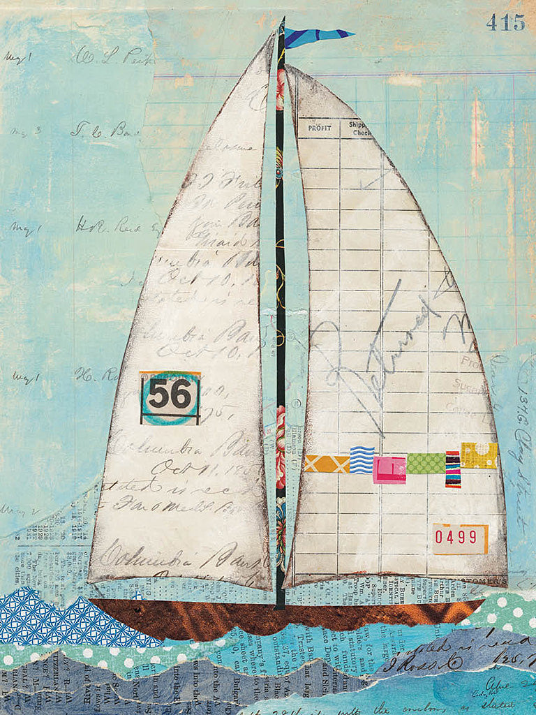 Elevate your coastal-themed room decor with this splendid sailboat art print, a pristine addition to any wall decoration collection. This unique mixed media artwork portrays a whimsical sailboat majestically adrift on serene blue waters, its sails a collage of vintage letters, ledger entries, and colorful patches of patterned textiles, symbolizing the vessel's storied journey across the seas. Each nautical detail lends a sense of history and adventure, making it a perfect piece for those drawn to oceanic and maritime aesthetics. The vibrant hues and textures on this print provide a delightful visual interest that will complement your existing home decor, whether hung in a living room, bedroom, or office space. Ideal for art enthusiasts and sea lovers, this tranquil sailboat illustration effortlessly transforms any wall into a focal point, bringing with it a breezy, relaxed vibe. It is a must-have for creating an inviting, inspirational ambiance that pays homage to the beauty of exploration and the spirit of the sea. Decorators and homeowners alike will find this art piece an invaluable addition, ensuring that your space stands out with its alluring maritime charm and artistic flair.For more art by Courtney Prahl click here.