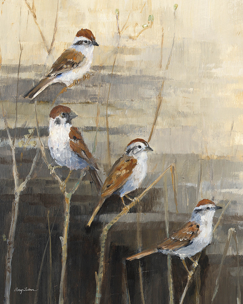 Elevate your home decor with this exquisite fine art print featuring a quartet of charming sparrows perched gracefully on delicate branches. The warm, neutral palette of creamy beiges and rich browns infused with subtle brushstrokes brings an organic, serene atmosphere to any room. This elegant avian-themed wall decor is a perfect choice for bird enthusiasts and art lovers alike, seeking to add a touch of natural beauty and sophistication to their living space, office, or personal sanctuary. The artwork's textured appearance and lifelike detail provide a captivating visual experience that will enhance the aesthetics of both contemporary and traditional interiors. Make this entrancing bird art print the focal point of your wall decor collection, and let the tranquil scene transform the ambience of your environment.For more art by Avery Tillmon click here.