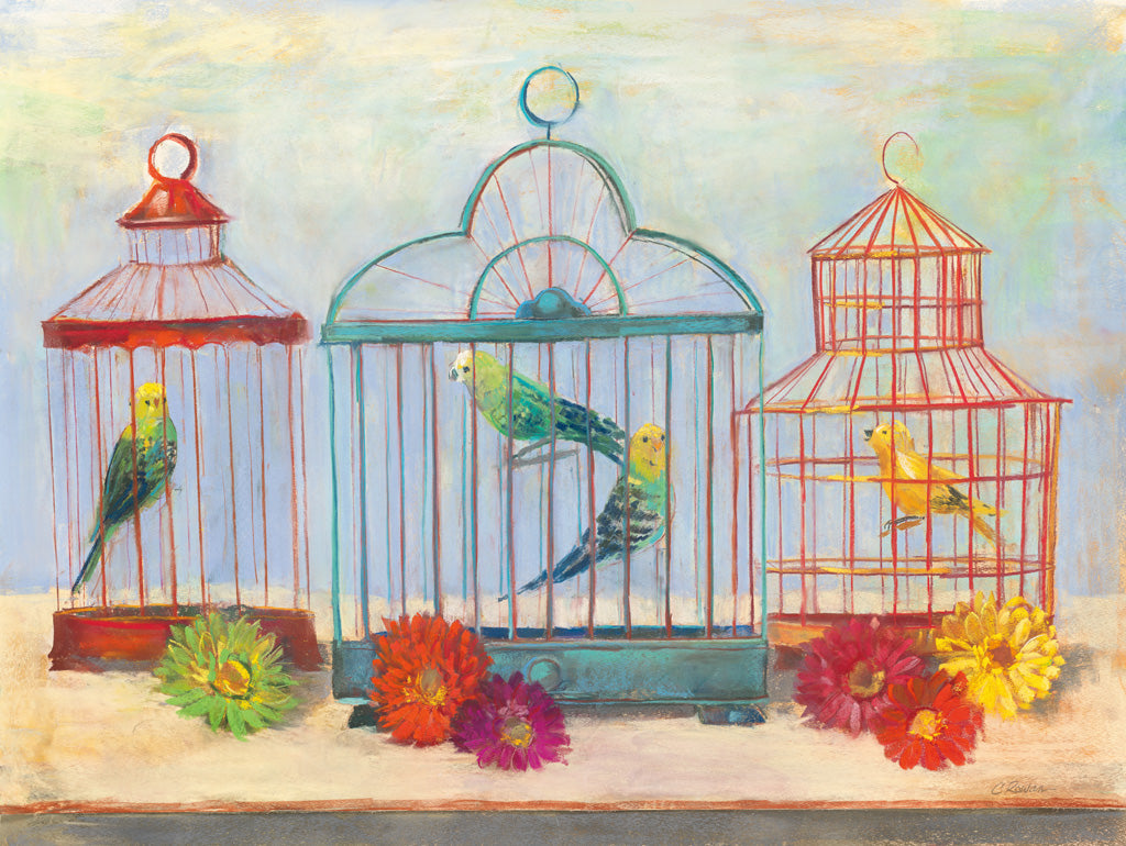Elevate the ambiance of any room with our tranquil "Vintage Birdcage and Floral Art Print," the perfect complement to your sophisticated wall decor collection. This charming print captures the essence of serene domesticity, featuring a soft-hued, pastel palette that instantly warms the space with a nostalgic glow. Adorning your walls with this piece ensures a timeless elegance that harmoniously blends with both modern and vintage-inspired interiors. In this exquisite representation, three elegant birdcages, each with a distinct architectural design, house vibrant, whimsical parakeets that draw the eye and intrigue the mind. The cages stand atop a neutral surface, and the composition is brought to life with an array of lush, blooming flowers at their base, adding a burst of natural beauty and color to the scene. The delicate brushwork and dreamy background suggest a serene environment that evokes a sense of calm and contentment. Ideal for bird lovers, art enthusiasts, or anyone looking to add a touch of graceful nature to their living space, this art print makes a splendid addition to a living room, bedroom, or home office. It's an impeccable choice for creating an inviting and peaceful atmosphere in your home. Hang this lovely art piece on your wall and let its subtle charm and chic aesthetic elevate your home's decor.For more art by Carol Rowan click here.