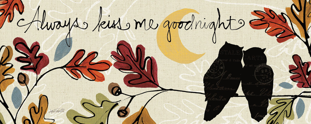 Bring a touch of romantic whimsy to your home with this charming "Always Kiss Me Goodnight" art print, perfect for infusing warmth and love into your bedroom wall decor. The earthy palette of rich reds, soothing blues, and olive greens creates an inviting autumn scene, while playful foliage and acorn motifs lend a rustic, bohemian flair to the piece. Central to the design are two silhouette birds perched cozily on a branch, evoking a sense of companionship and endearment. The crescent moon adds a tranquil nighttime ambiance, synchronizing beautifully with the endearing handwritten script that spreads across the canvas. This art print will create a cozy and loving atmosphere, making it an ideal addition for couples looking to personalize their space or as a thoughtful wedding or anniversary gift. Its versatile style ensures it will complement a variety of home decor themes, from modern farmhouse to contemporary minimalism. Add character to your interior design with this enchanting art piece that effortlessly marries the allure of nature with the sweet sentiment of affection.For more art by Anne Tavoletti click here.
