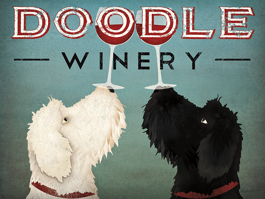 Elevate your home bar or dining room with this delightful "Doodle Winery" art print, perfect for dog lovers and wine aficionados alike. This charming wall decor features a pair of whimsical doodle dogs – one in creamy white and the other in rich black – standing tall and proud as they balance elegant wine glasses on their noses. Boasting a vintage vibe with its rustic lettering and textured background, this eye-catching print will add character and a touch of humor to your space. Ideal for those looking to infuse their interiors with personality, this high-quality art piece is printed on premium paper, ensuring vivid colors and a sharp image that will stand the test of time. It's an excellent choice for kitchen decor, a unique housewarming gift, or simply as a statement piece to show off your love of canines and fine wine. Combine it with other pet-themed prints to create an engaging gallery wall or let it stand solo as a focal point that is sure to spark conversations. Add this "Doodle Winery" art print to your collection of wall art and celebrate your passions in a stylish and sophisticated way. Don't miss out on the opportunity to enhance your living space with this adorable and tasteful illustration that is sure to brighten any room and bring smiles to the faces of all who enter.For more art by Ryan Fowler click here.