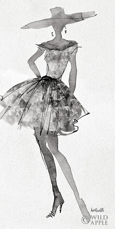 Elevate your interior with a touch of elegance and simplicity with this chic fashion-inspired art print. Ideal for those looking to add a sense of sophistication and a touch of the avant-garde to their living space, this monochromatic fashion sketch art print captures the essence of contemporary style and haute couture. The artwork features a stylized female figure adorned in a floral patterned dress with a flared skirt and a wide-brimmed hat, exuding grace and poise. This fashion illustration, rendered in delicate watercolor and ink strokes, makes for a captivating wall decor piece that seamlessly fits into a variety of interior design themes, from modern minimalist to eclectic and vintage-inspired spaces. Whether you're looking to dress up a bedroom wall, add character to your home office, or give your dressing area an artful backdrop, this art print is flexible in its ability to adapt to your decorating needs. Perfect for fashion enthusiasts, artists, and anyone with an eye for understated beauty, this art print serves as a daily reminder of the timeless appeal of fashion art. It's an excellent choice for gift-giving or for treating yourself to a piece of art that will keep your home looking stylish and curated. Add this fashionable wall art to your collection and enjoy a visual treat that will never go out of style.For more art by Anne Tavoletti click here.