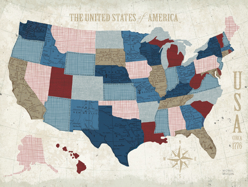 Elevate your interior design with this vintage-style USA Map Art Print, a must-have for any wall decor collection. Perfect for those seeking a touch of historical charm and geographical interest in their living space, this art print showcases a rich tapestry of state-by-state patterns, adding a rustic yet modern vibe to your home or office. Crafted with an eye for detail, each state on this visually captivating map is filled with a unique pattern, giving the piece an eclectic quilt-like appearance that's both engaging and educational. The subtle age-effect background lends an antique feel, as if the map were a treasured artifact from a bygone era. Featuring a classic color palette that complements any room's decor, this map art print includes a compass rose and the iconic "USA" text, subtly reminding viewers of the country's rich history since its founding in 1776. It's an excellent conversation starter and an ideal gift for cartography enthusiasts, history buffs, or anyone who appreciates artful interpretations of the United States landscape. Enhance your wall art collection with this sophisticated and timeless piece, ensuring your living space exudes a cultured and inviting atmosphere. Whether displayed in a home library, a student's room, or a corporate office, this USA Map Art Print is a versatile addition to any interior design theme.For more art by Michael Mullan click here.