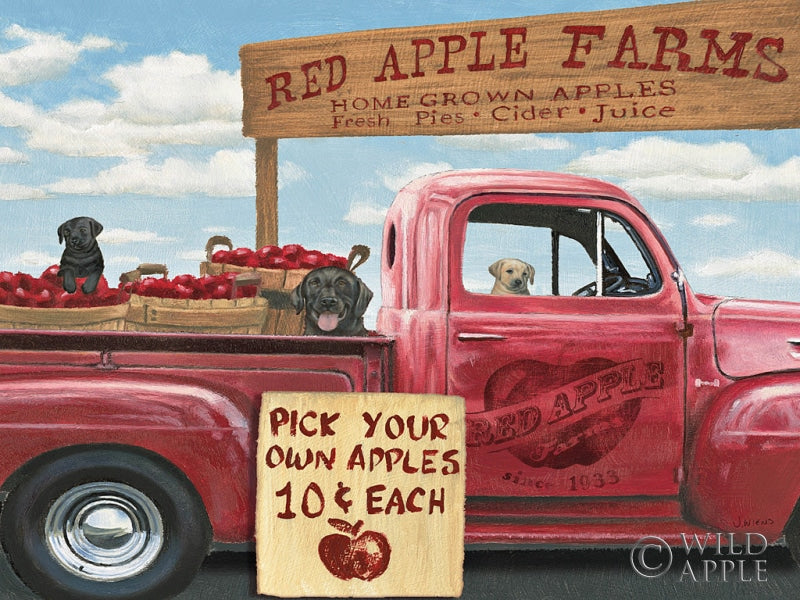 Add a touch of rustic charm to your space with our delightful vintage-style art print, perfect for enhancing any kitchen, dining room, or cozy corner of your abode. This charming wall decor features a classic red vintage truck from Red Apple Farms, brimming with baskets of lush, homegrown apples ready for the autumn harvest. The nostalgic Americana vibe is further heightened by the adorable presence of playful puppies—a black and a yellow lab adorably perched in the truck, adding a heartwarming element to the scene. Beneath the clear blue sky, a wooden farm sign invites viewers to indulge in the simple pleasures of fresh pies, cider, and juice, evoking memories of countryside escapades and family trips to the orchard. The detailed artwork captures the essence of agricultural life with a whimsical twist, incorporating a hand-painted sign in the foreground advertising "Pick Your Own Apples, 10¢ Each" that serves as a delightful nod to charming farm stands of a bygone era. This high-quality art print is the perfect addition to any collection of farmhouse wall art or for those looking to bring a slice of country living into their home decor. Its warm, inviting colors and endearing subject matter make it an ideal gift for dog lovers, vintage truck enthusiasts, or anyone who appreciates the beauty of rural landscapes and the nostalgia of America's pastoral heritage. Whether you're decking out your home with chic rural accents or searching for that standout piece to complete your wall art gallery,For more art by James Wiens click here.