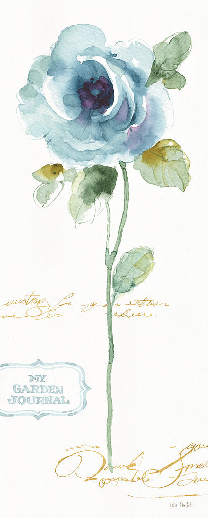 Elevate your interior with this exquisite watercolor rose art print, a timeless addition to any wall decor collection. The artwork features a beautifully rendered rose in delicate shades of blue with subtle green leaves, evoking a serene and romantic atmosphere. Crafted with fine attention to detail, the rose appears to bloom right before your eyes, infusing your space with the elegance of nature. This botanical print is perfect for those looking to add a touch of floral sophistication to their home, office, or as a gift for the garden enthusiast. The artwork includes understated script elements that complement the main focus, adding an extra layer of vintage charm and artistic flair. Whether you're creating a gallery wall or looking for a standalone piece, this watercolor rose art print brings a refined and peaceful element to any room. Ideal for those seeking to enhance their home with chic, botanical wall art and for collectors of unique watercolor prints.For more art by Lisa Audit click here.