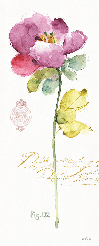 Elevate your living space with the serene beauty of our botanical art print, "Ethereal Peony Watercolor." This elegant wall decor piece, figure 02 in our exclusive collection, features a delicate and vibrant watercolor illustration of a blooming peony, rendered in soft hues of pink and green with a touch of yellow. The artwork showcases translucent petals and nuanced color gradations, capturing the essence of a flower in full bloom. Adding to its charm, the print is adorned with elegant script writing, which invokes a sense of vintage correspondence and timeless romance. This refined detail enhances the print's overall sophistication, making it an ideal addition to galleries or as a standalone statement piece. Crafted with meticulous attention to detail, our giclée art print is a perfect choice for those looking to add a touch of floral elegance to their home decor. Its vertical orientation is well-suited for narrow walls or as part of a larger gallery wall arrangement. Whether gracing the walls of a bedroom, living room, or office, "Ethereal Peony Watercolor" will infuse any space with the tranquil beauty of nature and the arts. Welcome the soothing feel of nature indoors with this exquisite wall art, designed to complement a wide range of interior styles from contemporary to traditional. It is a must-have for art enthusiasts, floral lovers, and anyone seeking to create a peaceful and attractive ambiance in their home or workplace.For more art by Lisa Audit click here.