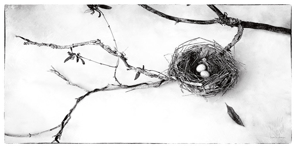 Decorate your space with the tranquil beauty of nature by adding this serene black and white art print to your wall decor collection. Captured in stunning detail, the image features a delicate bird's nest cradled among the slender branches of a tree, with two precious eggs resting safely within the woven twigs. The contrasting textures of the smooth eggs, the intricate nest, and the spindly branches are all set against a soft, subdued background that accentuates the peacefulness of the scene. This fine art print is perfect for those looking to create a calming atmosphere in their home or office. It's an exquisite choice for lovers of minimalist decor, black and white photography enthusiasts, and anyone seeking to infuse a touch of natural elegance into their living space. The piece is versatile enough to elevate a contemporary gallery wall or stand alone as a focal point in a simplistic, modern setting. Whether you're redecorating your living room, searching for the perfect statement piece for your entryway, or looking to bring a sense of serenity to your bedroom, this stunning portrayal of life's delicate beginnings will surely captivate and inspire. Ideal for interior design themes ranging from rustic charm to urban chic, this art print will be a timeless addition to your collection of sophisticated wall decor. Bring home this evocative nature scene and let it remind you daily of the beauty and simplicity to be found in the natural world.For more art by Debra Van Swearingen click here.