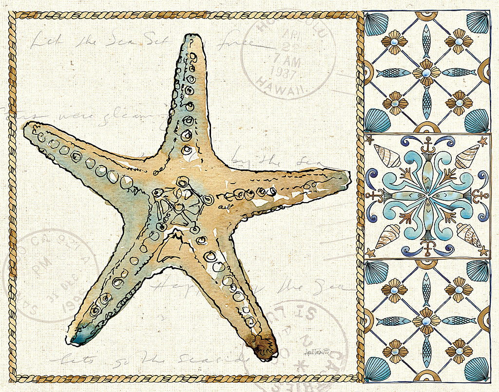 Elevate your space with this captivating Vintage Nautical Starfish Art Print, the ideal addition for aficionados of marine-inspired wall decor. Perfectly suited to add a touch of oceanic charm to any room, this art piece features a beautifully illustrated starfish, rendered with intricate detailing and subtle color gradients that capture the essence of coastal aesthetics. Surrounded by a border that evokes the rustic feel of old nautical maps, the artwork is complemented by a series of nautical motifs including seashells and anchors intertwined with classic geometric patterns in a harmonious side panel, providing a visual balance that's both elegant and whimsical. The aged paper background, complete with postal stamp elements and script handwriting, imbues the print with a sense of vintage allure and historical depth, making it an intriguing conversation starter. This high-quality print effortlessly blends nautical charm with a dash of antique flair, creating an alluring piece of wall art that is ideal for decorating homes, beach cottages, or seaside retreats. Whether you're looking to enhance your living room, bedroom, entryway, or office with a coastal vibe, this nautical starfish art print is a timeless selection that will complement a variety of decor styles. Immerse yourself in the serene beauty of the sea and bring the tranquility of the ocean to your indoors with this enchanting and unique decorative artwork.For more art by Anne Tavoletti click here.