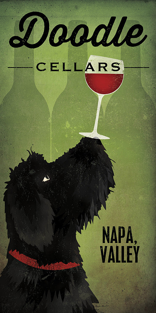 Adorn your living space with a whimsical touch by adding this delightful "Doodle Cellars Napa Valley" art print to your collection of wall decor. Ideal for wine enthusiasts and dog lovers alike, this captivating print features an elegantly stylized black doodle dog with a lustrous red collar, poised beneath a sophisticated wine glass. The bold, cursive lettering "Doodle Cellars" crowns the illustration, complementing the rustic charm of the Napa Valley inscription at the base. The vintage-inspired green background, reminiscent of aged wine bottles, provides a charming backdrop for the black silhouette, making this piece a conversation starter for any dining room, kitchen, or home bar area. Enhance the ambiance of your home with this unique piece of art, perfect for adding a touch of playful elegance to your interior design scheme.For more art by Ryan Fowler click here.