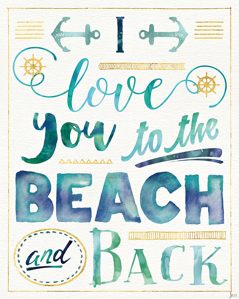 Enhance your living space with our charming, nautical-themed watercolor art print, perfect for adding a serene beach-inspired ambiance to any room. This delightful wall decor features the heartwarming phrase "I love you to the beach and back" rendered in a beautiful blend of aqua and teal hues, reminiscent of ocean waves and coastal breezes. Maritime motifs, including whimsical anchors and a classic ship's wheel, are thoughtfully interspersed throughout the design, each sporting a unique texture and color that mimic the natural variations found in sea and sand. This high-quality art print is a wonderful addition to your coastal home decor or a thoughtful gift for beach lovers and those who cherish seaside memories. Printed on premium paper with vivid, lasting colors, it comes ready to frame and hang in a common size for easy integration into your gallery wall or to stand out as a focal piece. Whether for a beach house, bathroom, bedroom, or any living area, this art print will infuse a sense of love and ocean tranquility into your daily life. Embrace a touch of coastal elegance and whimsy with this exquisite wall accent, sure to be admired by all who appreciate the beauty of the beach and the sentimentality of a loving message.For more art by Jess Aiken click here.