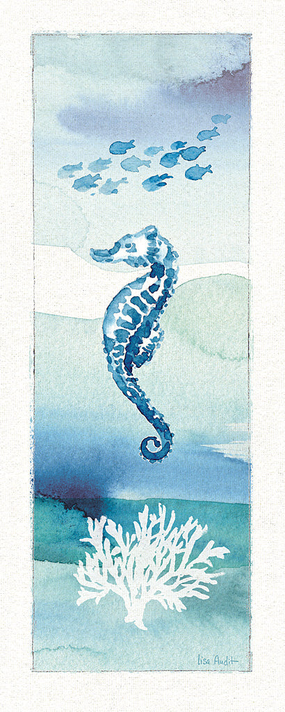 Immerse your space in the serene beauty of the ocean with our exquisite seahorse art print - a tranquil addition to any wall decor collection. Crafted with delicate watercolor techniques, the artwork presents a charming seahorse floating gracefully among a school of fish against a soothing backdrop of marine hues. Beneath the seahorse, a detailed white coral adds a touch of elegance and intricacy to the composition. Ideal for coastal themed interiors or as a calming presence in a bustling home or office environment, this nautical print serves as a perfect focal point or a harmonious addition to a gallery wall. Enhance your decor with this captivating piece that brings the essence of the ocean's tranquility right into your living space, promising a serene ambiance and an enduring appeal to all who appreciate the wonders of sea life. Add a splash of underwater magic to your home with this peaceful, ocean-inspired wall art.For more art by Lisa Audit click here.