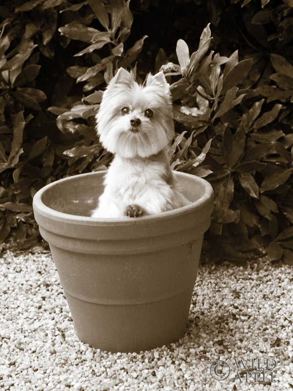 Discover a charming addition to your home decor with our adorable sepia-tone art print featuring a delightful little dog perched within a classic terracotta pot. Nestled amongst lush greenery on a bed of decorative pebbles, this heartwarming and whimsical image captures the innocent curiosity of our furry friend, making it a perfect wall accent for any pet lover or anyone looking to add a touch of playfulness to their interior design. The monochromatic palette lends a timeless feel, ensuring this piece complements a variety of decor styles, from rustic to modern. Hang this enchanting print in your living room, bedroom, or hallway to infuse your space with the lighthearted spirit of nature and animals, creating a cozy and inviting atmosphere. Whether you're an art aficionado or simply seeking a unique piece to enliven your wall decor collection, this art print is sure to be a conversation starter and a delightful focal point in your home.For more art by Jim Dratfield click here.