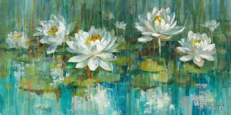 Elevate your living space with the tranquil serenity of our "Ethereal Water Lilies" art print, a captivating piece of wall decor that brings the peaceful essence of nature's beauty right into your home. This exquisite print showcases a cluster of delicate water lilies floating gracefully on a serene pond, with each petal meticulously painted to exude elegance and purity. The vibrant hues of blue and green meld together to create a reflective water surface, producing a mesmerizing mirror effect that adds depth and sophistication to the artwork. Ideal for those looking to infuse their interior with a touch of fine art and natural charm, this art print is a sophisticated choice for bedrooms, living rooms, or any area in need of an artistic touch. The use of light and shadow is expertly crafted to give the lily pads and blossoms a lifelike appearance, making it an eye-catching focal point that would complement both modern and traditional decor themes. Whether you're a lover of floral prints, seeking a calming atmosphere, or in search of the perfect accent for a gallery wall, our "Ethereal Water Lilies" art print is a timeless addition to your collection of elegant home decorations.For more art by Danhui Nai click here.