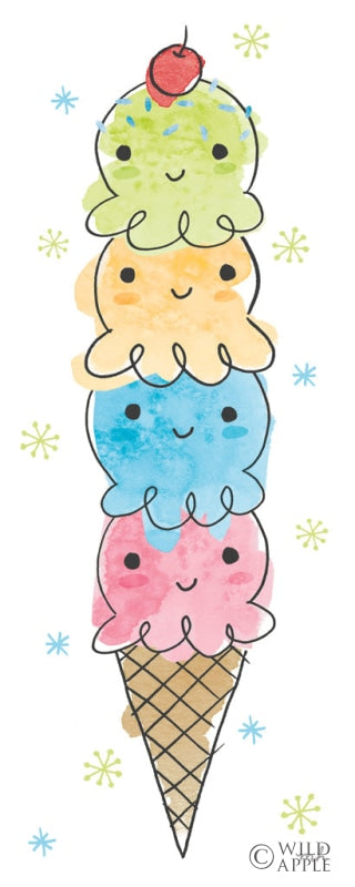 Bring a delightful touch of whimsy to your space with our charming "Smiling Scoops" art print, a playful and colorful addition to any wall decor collection. This eye-catching illustration features a delightful stack of five friendly ice cream scoops, each sporting a cute, smiling face that is sure to bring joy and a sense of playfulness to your room. From the cheerful cherry-topped green scoop at the summit to the rosy pink foundation, this adorable tower of ice cream is illustrated with a soft watercolor texture that adds a handcrafted feel to the print. Tiny accent stars sprinkled throughout the design contribute to a lighthearted, magical atmosphere, making this print a perfect fit for spaces that aim to inspire happiness and imagination. Art enthusiasts and ice cream lovers alike will appreciate the subtlety of pastel hues and the gentle expressions of each scoop, which come together to create an ambiance of fun and relaxation. Ideal for a child's bedroom, a quirky living room or even a cozy kitchen, this art print is versatile and can complement various interior design themes, from contemporary to eclectic. Our "Smiling Scoops" art print is sure to become a conversation starter and a favorite among guests of any age. It's an exquisite piece for anyone in search of unique wall art that combines the sweetness of dessert with the innocence of child-like joy. Whether you are decorating your first apartment, sprucing up your home office, or gifting a friend who adores unique wall accentsFor more art by Moira Hershey click here.
