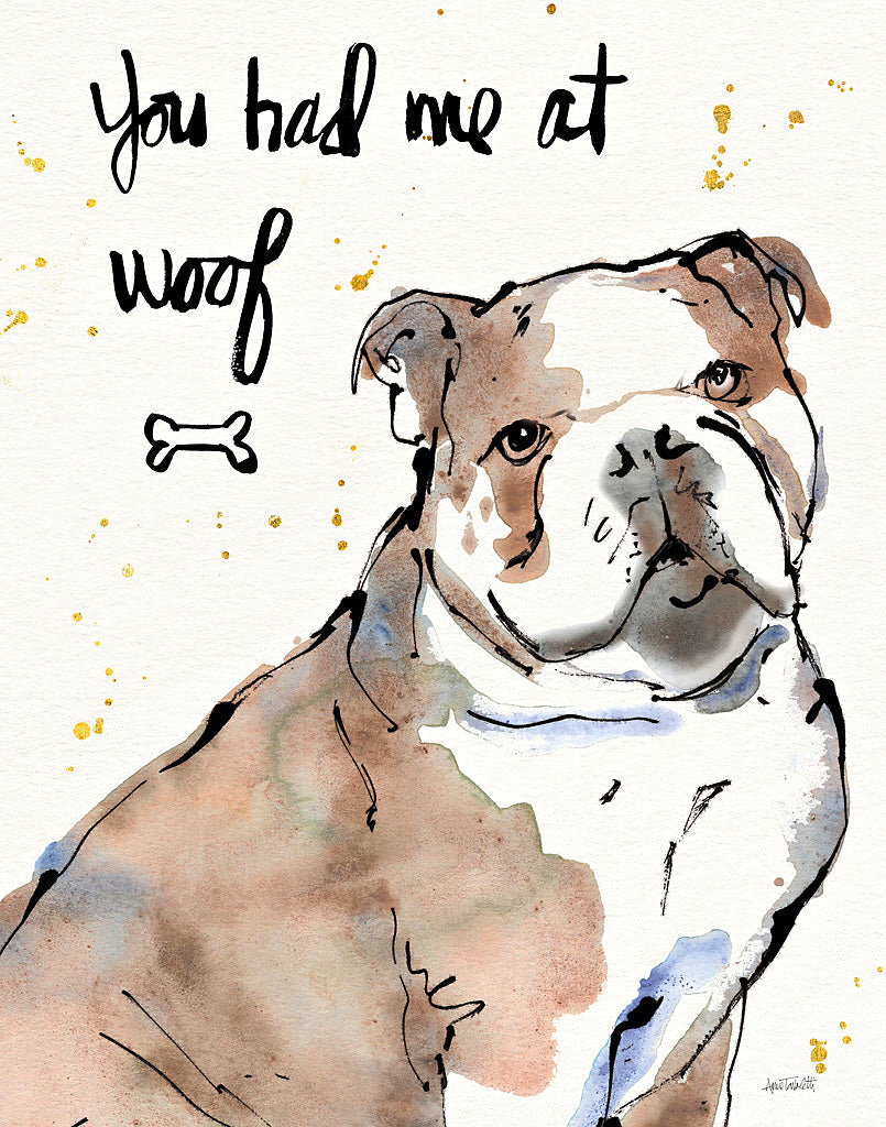 Brighten up your living space with this charming and whimsical watercolor art print, a perfect addition to any pet lover's home decor collection. Capturing the essence of canine admiration, this illustration features an adorable portrayal of a bulldog accompanied by the playful phrase "you had me at woof," elegantly scripted to add a touch of personality and humor to your wall decor. The delightful mix of soft watercolor tones and expressive ink outlines creates a captivating visual appeal, while the speckles of gold paint add a luxurious and modern twist to this delightful portrayal of man's best friend. This delightful bulldog art print is not only an eye-catching centerpiece but also a heartwarming reminder of the joyful companionship dogs bring into our lives. Ideal for hanging in a living room, bedroom, or even a pet-centric gallery wall, this endearing artwork is sure to fetch compliments from all who see it. Whether you're looking to showcase your love for pets or searching for the perfect gift for a fellow dog enthusiast, this art print is a timeless piece that unites artistry with the affectionate bonds we share with our furry friends.For more art by Anne Tavoletti click here.