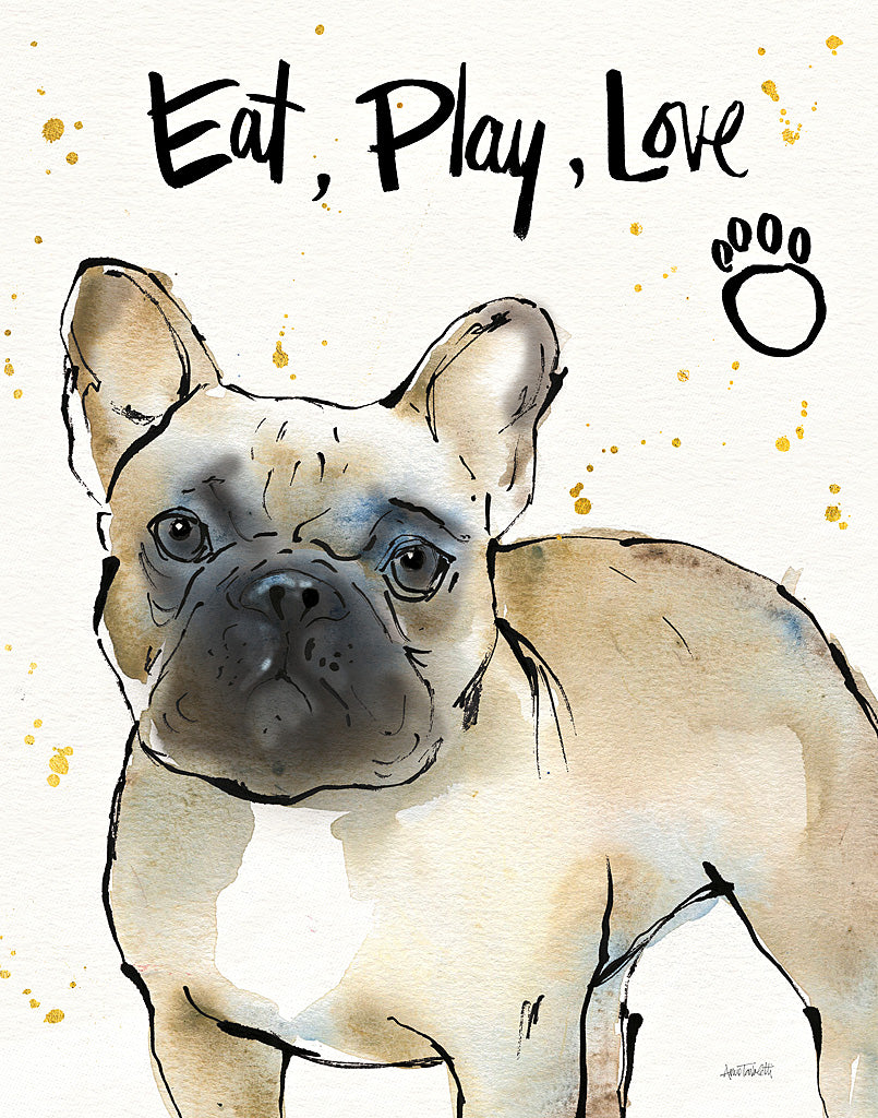 Brighten up your living space with this charming and whimsical French Bulldog art print, a delightful addition to any pet lover's collection. The artwork boasts a playful Frenchie in a watercolor style with enchanting splashes of gold, capturing the breed’s lovable and playful spirit, complete with the cheerful phrase "Eat, Play, Love" that adds a touch of inspiration to your daily life. This high-quality wall decor piece is perfect for adorning the walls of your living room, bedroom, or even a cozy nook in your home. Embrace the joyful essence of man's best friend and add a unique, heartwarming touch to your interior decor with this exquisite French Bulldog art print. Whether you're a dog enthusiast or a connoisseur of fine art prints, this piece is sure to evoke smiles and a warm atmosphere in any room it graces.For more art by Anne Tavoletti click here.