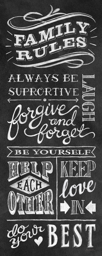 Elevate the warmth and charm of your home with our inspirational "Family Rules" art print, a delightful addition to any wall decor collection. This monochromatic piece is expertly designed to blend seamlessly with any interior style, featuring a series of heartfelt, guiding principles artistically laid out in a variety of elegant, hand-drawn typographic styles. Perfect as a focal point in your living room, kitchen, or hallway, this art print includes uplifting messages such as "Always be supportive," "Laugh," "Forgive and forget," "Be yourself," "Help each other," "Keep love in," and "Do your best." Crafted with the highest quality in mind, this art print is not only a decorative piece but also a gentle, daily reminder of the values that make a house a home. The use of a chalkboard-style background gives it a rustic, yet contemporary appeal, making it an ideal gift for housewarmings, weddings, or as a touching family heirloom. Whether you're looking to inspire your family members or simply add a touch of coziness to your space, our "Family Rules" art print is a timeless choice that is sure to enhance your home's aesthetic. Order now and infuse your environment with a sense of love, harmony, and modern elegance.For more art by Mary Urban click here.