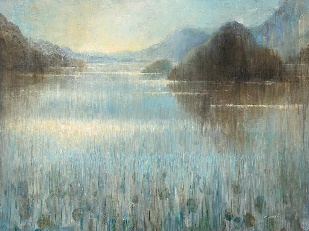 Add a tranquil touch to your space with our Serene Lakeside Scenery Art Print. Perfect for those seeking a touch of nature-inspired tranquility for their home decor, this exquisite print captures the calming essence of a misty morning by the lake. The art features a beautifully soft-hued palette, portraying the subtle interplay of light and reflections on the water. Gentle hills frame the serene lake, evoking a sense of depth and peacefulness. The foreground of the image is adorned with delicate botanical elements that emerge from the water, adding an organic texture to this idyllic scene. The artwork's ethereal quality makes it an ideal choice for living room wall art, bedroom decor, or as a soothing viewpoint in your office space. Invite the stillness of nature into your environment with this evocative piece, a must-have for enthusiasts of landscape prints and lovers of nature's quiet beauty. Enhance the ambiance of any room with this soul-soothing piece that exemplifies timeless elegance in wall decor.For more art by Danhui Nai click here.