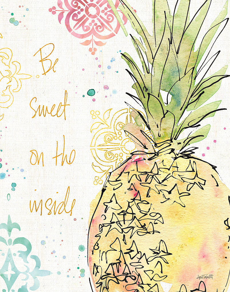 Elevate your home decor with this exquisite watercolor pineapple art print, a perfect blend of tropical charm and inspirational messaging that reads "Be sweet on the inside." This vibrant wall art piece brings a splash of color and positivity to any room, making it an ideal accent for those looking to enhance their living space with art that speaks to the heart. The art print features a beautifully rendered pineapple in warm hues of yellow and green, adorned with intricate patterns and whimsical splashes of pastel pinks and blues, evoking a sense of playfulness and creativity. Crafted with attention to detail, this high-quality print captures the essence of hand-painted artistry, ensuring that each stroke and color pops against the textured canvas-like background. Its boho-chic design elements make it an on-trend accessory for those who appreciate modern yet timeless styles in their home, office, or cozy nook. As a versatile piece of wall decor, it can stand alone as a statement print or be combined with other artwork to create a personalized gallery wall. This art print is perfect for anyone who loves fresh, botanical themes with a touch of motivational flair, making it a thoughtful gift for friends and family or a splendid treat for yourself. Bring home this delightful piece today and let its warmth and inspiration transform your space into a sanctuary of style and positivity.For more art by Anne Tavoletti click here.