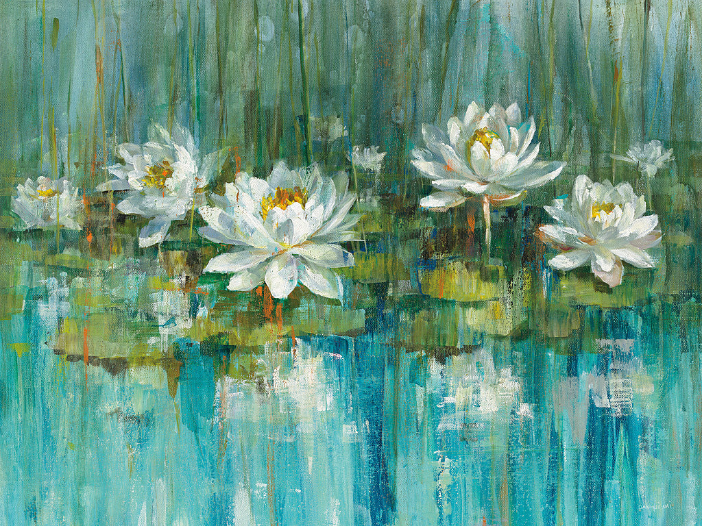 Elevate your living space with the serene beauty of our water lily canvas art print, a must-have for any lover of floral wall art and nature-inspired decor. This exquisite piece showcases a tranquil pond brimming with elegant white water lilies floating gracefully atop vivid reflections of azure and emerald hues. The impressionistic brushwork adds texture and depth, evoking the peaceful essence of a lush, waterside garden. Perfect for those looking to infuse their home with a touch of botanic calmness, this high-quality canvas art print is versatile enough for a variety of interior design schemes, from contemporary to classic. It's an ideal statement piece for your living room, bedroom, or even a meditative space where the calming influence of the water lilies can be fully appreciated. This ready-to-hang wall decor features intricately detailed blossoms, each petal catching the light in a dance of delicate shades of white and subtle yellows, set against a backdrop of soothing greenery. The painting's reflective water further enriches the visual experience, its gentle ripples adding to the overall sense of tranquility. With its captivating subject and masterful execution, this water lily wall art is a prime choice for art collectors, nature enthusiasts, or anyone seeking to create an atmosphere of relaxed elegance. Don't miss the opportunity to transform your room into a sanctuary with our stunning water lily canvas art print, a testament to the timeless allure of nature's beauty.For more art by Danhui Nai click here.
