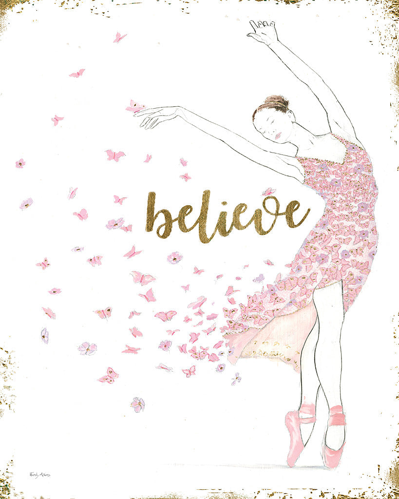 Adorn your space with inspiration and grace with our "Believe" Ballerina Art Print, a captivating piece of wall decor perfect for ballet enthusiasts and those seeking a touch of elegance for their home or office. This exquisite illustration showcases a delicate dancer, poised en pointe, her dress a cascade of intricately detailed pink flowers that seem to transform into a flurry of butterflies around her. The word "believe" is beautifully scripted in a shimmering gold tone, evoking a sense of magic and possibility. Perfect for hanging in a little dancer's bedroom, adding a soft, feminine touch to a living space, or as a daily reminder to hold onto your dreams, this art print brings both beauty and an uplifting message. Printed on high-quality paper with attention to color and detail, it's a unique and thoughtful gift for dance teachers, performers, or anyone who loves the arts. Incorporate this piece into your gallery wall, or let it stand alone as a striking focal point. It pairs wonderfully with minimalist, contemporary, or shabby chic decor styles. Elevate your interior design with this charming and motivational ballet-inspired art print, a subtle yet sophisticated addition to your curated collection of wall art.For more art by Emily Adams click here.