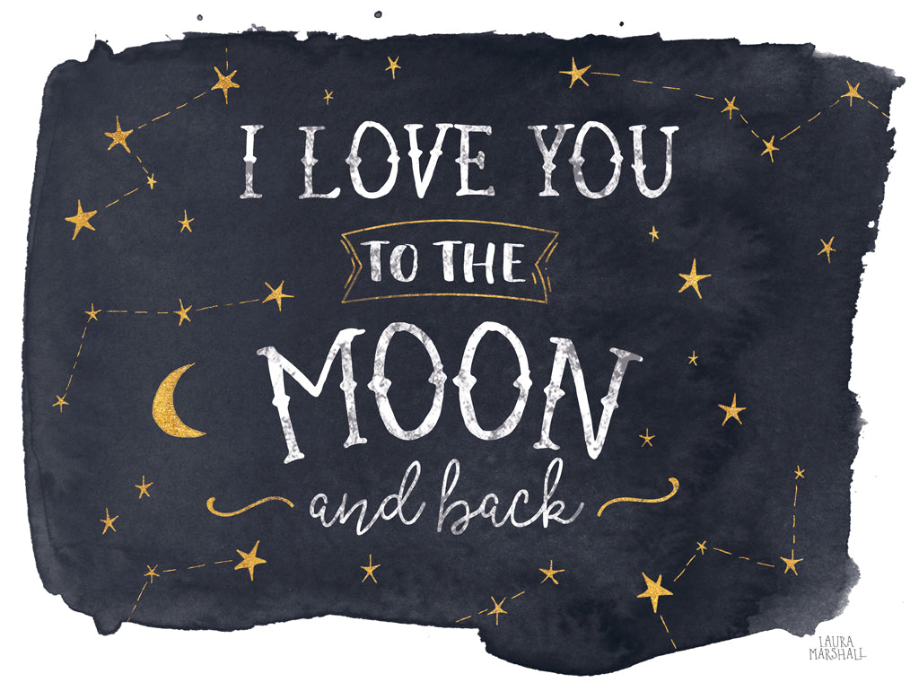 Elevate your home ambiance with this enchanting 'I Love You to the Moon and Back' art print, perfect for creating a cozy and romantic atmosphere in any space. This whimsical wall art piece features a celestial theme, complete with a crescent moon, shimmering stars, and delicate constellations, all set against a deep, midnight blue backdrop. Crafted with tender care, the phrase 'I Love You to the Moon and Back' is artfully inscribed in an elegant, hand-lettered font that evokes a sense of timeless affection and warmth. The golden hues of the lettering and moon contrast beautifully with the dark background, adding a touch of luxury and subtle sparkle to your wall decor collection. Ideal for hanging in a bedroom, nursery, or any nook in need of a heartfelt touch, this art print makes for an exquisite gift or a precious addition to your own home. Its versatile design harmonizes with both contemporary and traditional decors, making it a superb choice for anyone looking to enhance their interior with a piece that speaks volumes of love and adoration. This art print is available in various sizes to suit your wall space, and is printed on high-quality paper with premium inks that ensure longevity and vivid colors. Bring the magic of the night sky inside and let this beloved message be a constant reminder of the boundless love that fills your life.For more art by Laura Marshall click here.