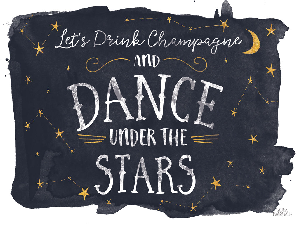 Elevate the ambiance of any room with this enchanting, celestial-themed art print featuring the whimsical phrase "Let's Drink Champagne and Dance Under the Stars" in an elegant, hand-lettered script. This charming and inspirational wall decor piece is perfect for adding a touch of whimsy and romance to your living space, bedroom, or entertainment area. Its dark background suggestive of the night sky, adorned with playful illustrations of stars and a crescent moon, creates a dreamy and sophisticated atmosphere. The art print's unique design, with varying font styles and sizes, adds dynamic visual interest and a modern twist to your interior design. Measuring [specify dimensions], this high-quality print is a versatile addition to your curated gallery wall or as a standout piece to inspire daily. Whether you’re looking to infuse your home with a bit of nocturnal magic or searching for the perfect gift for a champagne enthusiast or a stargazer, this print is bound to captivate and add a sense of celebration to any wall it graces.For more art by Laura Marshall click here.