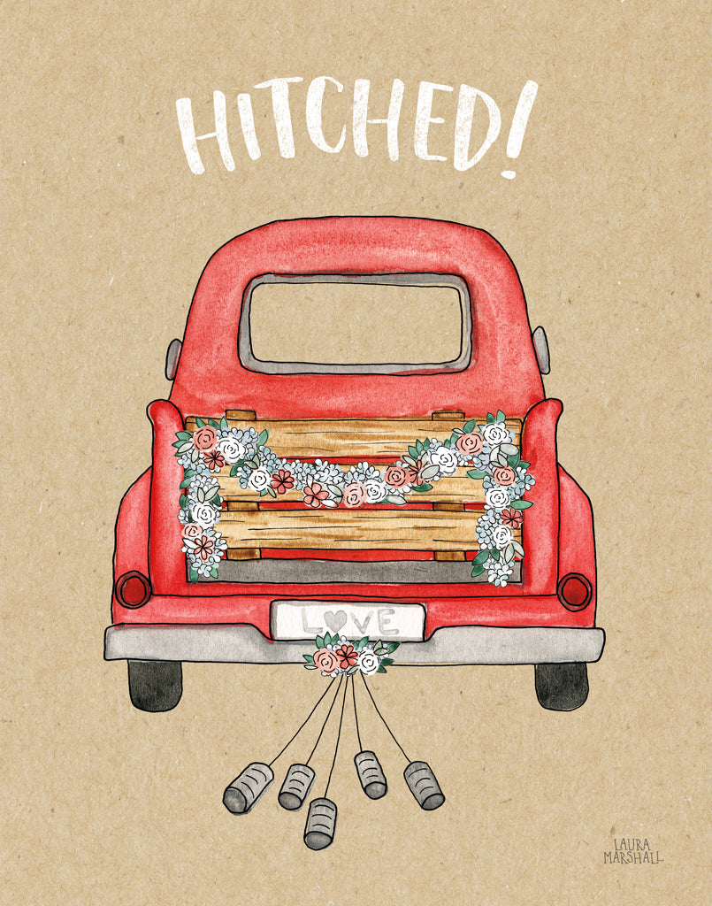 Decorate your space with a charming and heartwarming touch with our "Hitched" Vintage Truck Art Print. Perfect for adding a dash of whimsical romance to your wall decor, this captivating print features a classic red pickup truck with the cheerful word "HITCHED!" boldly inscribed above. The truck bed is brimming with a vibrant assortment of beautifully illustrated flowers, symbolizing love and togetherness. Below, the vehicle proudly displays a license plate inscribed with the word "LOVE," while a playful cascade of tin cans trail behind, capturing the bliss of a just-married couple in an endearing, nostalgic tradition. Crafted with an eye for whimsy and nostalgia, this art piece, set against a rustic kraft paper background, lends a homey and artisanal feel to your living room, bedroom, or entryway. Whether you're searching for the perfect gift for a wedding, anniversary, or just want to enhance your own collection of eclectic home decor, this print strikes an ideal balance between romantic flair and vintage charm. With its versatility and unassuming elegance, it will surely become a beloved focal point in any modern farmhouse, country cottage, or shabby chic interior design scheme. Invite the essence of love and vintage vibes into your home with this unique and delightful wall art—sure to be a conversation starter and a testimony to life's simple, loving moments.For more art by Laura Marshall click here.