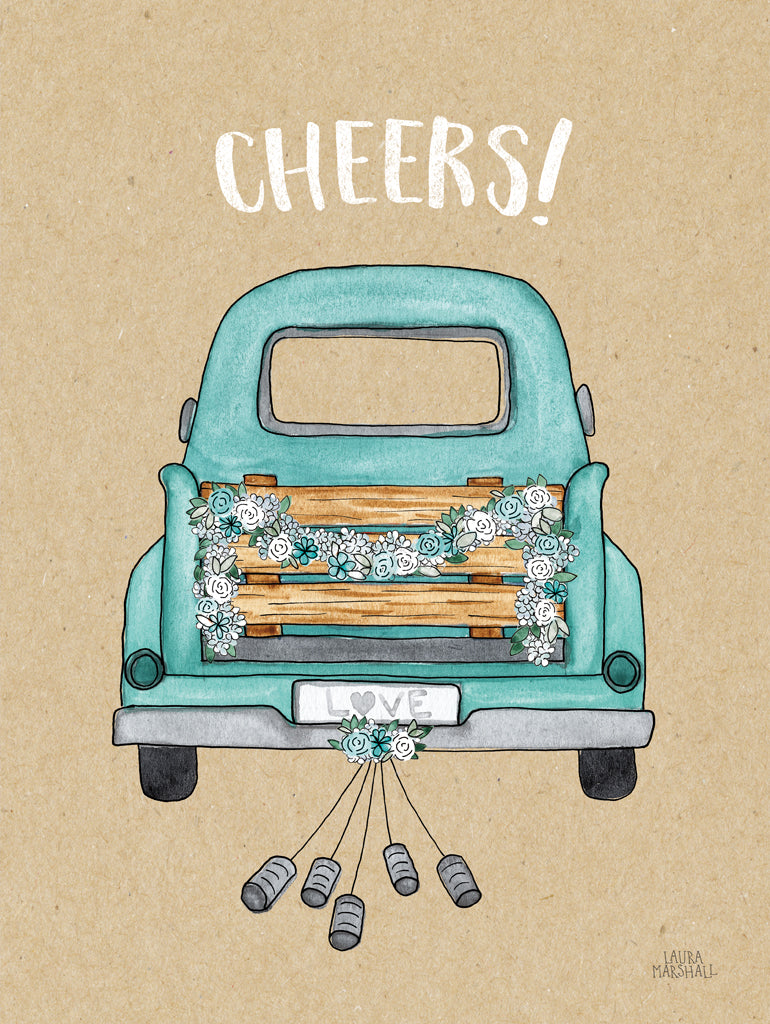 Bring a touch of whimsical charm to your home with our delightful vintage-inspired art print. This unique wall decor showcases a classic teal pickup truck from a bygone era, exuding rustic appeal and nostalgia. The truck is whimsically adorned with a wooden crate filled with an array of beautifully illustrated white flowers, adding a serene botanical vibe to the piece. Above the vehicle, the word "CHEERS!" is playfully inscribed, inviting a joyful atmosphere into your space. Perfect for those who appreciate the fusion of floral elements with retro automotive design, this print will be a conversation starter. Its earthy background lends a natural, organic feel, harmoniously blending with your existing decor. Ideal for hanging in the living room, dining area, or even a home office, it's a versatile addition to any interior design scheme. The text "LOVE" on the license plate along with the dangling tin cans tied to the back of the truck add a touch of romance, reminiscent of a just-married couple's getaway car, making this print a perfect gift for weddings, anniversaries, or as a symbol of love and happiness in your own home. Crafted with care, our art print is a must-have for collectors and enthusiasts looking to enhance their collection of charming, vintage-style wall art. Whether you're curating a gallery wall or simply looking for a standout piece to brighten up your room, this art print brings personality and whimsy into any interior space.For more art by Laura Marshall click here.