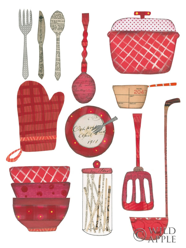 Enhance your kitchen or dining area with this charming collection of culinary-themed art prints, designed to add a touch of rustic elegance to your home decor. This lovely assortment features a variety of kitchen utensils and accessories, all rendered in an artful collage style that combines text, patterns, and splashes of rich red color. Contents include an intricate fork, knife, and spoon set, where each piece is adorned with delicate script writing that evokes a sense of vintage charm. An artistically twisted ladle showcases whimsical design, while a pot holder and oven mitt set exude a cozy, homey vibe with their checkered and quilted patterns. A decorative plate and a pair of whimsical kitchen containers—ideal for storing utensils or dry goods—invite a look of organized nostalgia. These containers exhibit a blend of polka-dot and diamond motifs, paired with a sprinkle of golden embellishments to catch the eye. A classic hand whisk and old-fashioned eggbeater present a tribute to traditional baking tools, completing this curated selection that's perfect for gifting or to procure for your own space. The artful representation of a spatula and a filter scoop, each illustrated with a dreamy dash of color, harkens back to a time of handcrafted cookery. Perfect for the culinary enthusiast or anyone looking to add a dash of vintage flair, these art prints fit beautifully into a variety of interior design styles, from farmhouse chic to modern minimalist. Onlookers will delight in theFor more art by Courtney Prahl click here.