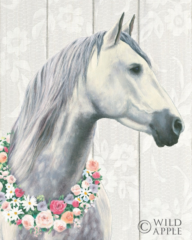 Elevate your home decor with this exquisite equine art print, a perfect blend of modern chic and rustic charm. Adorn your walls with this captivating image of a regal horse, poised gracefully against a textured, soft-hued wooden backdrop. The horse's silhouette is intricately rendered with delicate shading and fine details, highlighting its noble profile and serene expression. As a focal point of this piece, the horse is adorned with a lush garland of flowers, featuring a harmonious assortment of roses and daisies that cascade along its neck, adding a touch of finesse and color. The floral arrangement, rich in pastel pinks, whites, and subtle greens, brings a whimsical and romantic atmosphere to any space. This art print makes an ideal addition to your living room, bedroom, or even a cozy reading nook, infusing a sense of tranquility and nature-inspired beauty. Whether you're a horse lover, a floral enthusiast, or a connoisseur of fine art, this print will complement your aesthetic and create an enchanting ambiance. Perfect for gift-giving or as a statement piece for your own wall art collection, this print is a versatile choice for those looking to enhance their interior design with elegant artwork. Add this timeless piece to your collection today and enjoy the serene elegance it brings to your home environment.For more art by James Wiens click here.