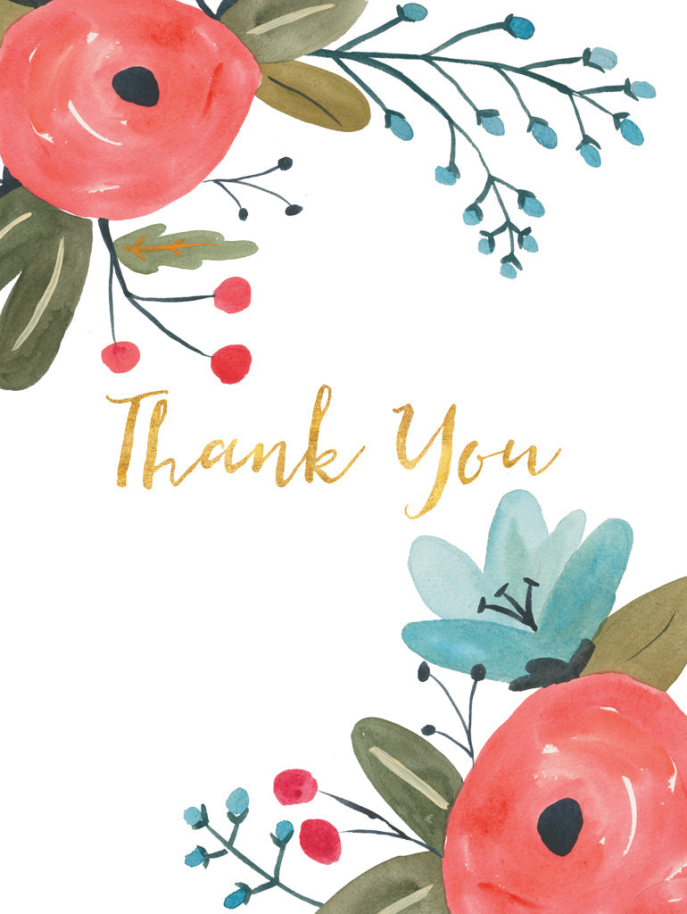 Elevate the ambiance of any space with this elegant and cheerful floral watercolor art print, perfect for adding a touch of refinement to your wall decor collection. The print features a delightful composition of vibrant coral and serene blue blossoms, interspersed with sprightly green foliage and delicate berry accents, all coming together to frame a gracefully hand-lettered "Thank You" in a warm gold tone. This art print exudes a fresh, botanical aesthetic that could complement a variety of interior styles, from modern minimalist to shabby chic. Crafted with the finest attention to detail, the print boasts rich, saturated colors and beautifully defined brush strokes that bring the charm of hand-painted watercolor to life. It's an ideal choice for someone looking to infuse their living space, home office, or bedroom with a touch of nature-inspired beauty. Moreover, it serves as a thoughtful gift to express gratitude, making it an exquisite addition to your range of thank you cards and personalized gifts. The art print comes in a variety of sizes to suit different spaces and framing options, ensuring that it can be a standout piece or integrate seamlessly into a gallery wall. With its versatile design, it can also be a staple product for festive occasions, from weddings to housewarmings. Appeal to customers searching for botanical prints, watercolor flower wall art, or thoughtful thank-you gifts by featuring this exquisite piece in your art prints store.For more art by Wild Apple Portfolio click here.