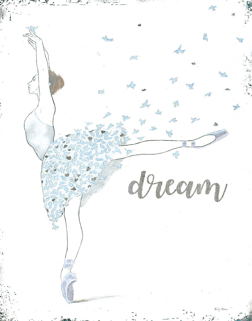 Elevate your home decor with an enchanting touch of grace and tranquility by bringing home this exquisite ballerina art print. Ideal for those who cherish elegance and serenity in their wall decor, this print captures the poised movement of a graceful ballerina as she extends in a classical ballet pose. Delicate blue butterflies seem to emerge from her tutu, adding a whimsical flourish that suggests movement and dreams taking flight. Highlighted by a subtle background and the inspirational word "dream" scripted in an evocative, gentle font, this art piece embodies the beauty of dance and the power of aspiration. This wall art is perfect for adorning your living room, bedroom, or even a dance studio, setting an uplifting mood and serving as a daily reminder to reach for your dreams. Crafted with meticulous attention to detail, the soft color palette ensures that this print will complement any interior design scheme, from minimalist to contemporary chic. It's not just a simple illustration; it's a statement piece that blends the artistry of dance with the tranquil beauty of nature, making it an ideal gift for ballet enthusiasts, art collectors, or anyone aspiring to add a touch of lyrical sophistication to their space. Indulge in the timeless elegance of this ballerina and butterflies art print, and let your walls speak to the dreamer within you.For more art by Emily Adams click here.