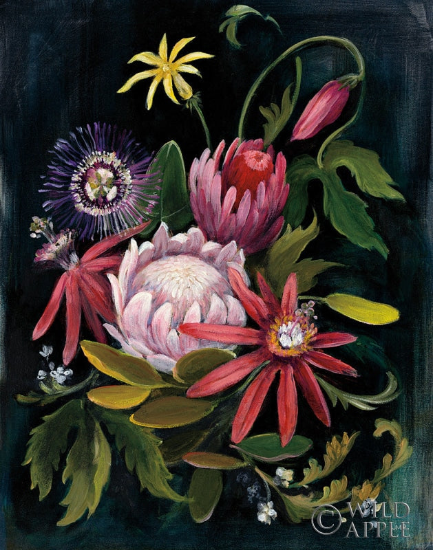 Elevate your home decor with this exquisite botanical art print, a perfect fusion of elegance and nature's vibrancy for any wall space. Our premium-quality art print features a captivating arrangement of lush floral blossoms, including pink and red protea flowers, a delicate yellow star-shaped bloom, and a stunning purple passion flower with its unique corona threads. The rich, dark background provides a dramatic contrast that enhances the vivid colors and intricate details of each petal and leaf. Rendered with masterful brushstrokes, this piece brings the allure of a midnight garden into your living room, bedroom, or office. Crafted with the finest printing techniques on high-grade materials, this wall decor captures the original texture and depth of the artwork. The serene beauty of this floral collection will add a touch of sophistication and a natural aesthetic to any interior design scheme. Whether you're a fan of classic botanical illustrations or looking for a statement piece to complete your gallery wall, this art print offers a timeless appeal and serves as a stylish centerpiece. Sustainably packaged and ready to frame, this wall art is available in various sizes to accommodate your space requirements, making it an ideal gift for art enthusiasts, garden lovers, or anyone seeking to enhance their home with evocative and charming wall decor. Explore the beauty of nature's blooms and infuse your environment with tranquility and artistry with this must-have botanical art print.For more art by Julia Purinton click here.