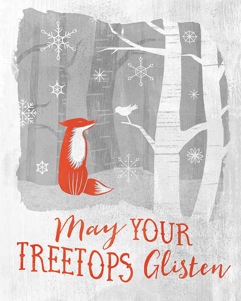 Transform your living space into a winter wonderland with this charming and rustic "May Your Treetops Glisten" art print. Perfect for seasonal decor, this eye-catching wall accent showcases a stylized red fox amongst serene birch trees, highlighted by delicate snowflakes that seem to dance through the air. The soft hues of the grey and white background evoke the feeling of a crisp, frosty morning, while the red fox adds a heartwarming pop of color. The phrase "May Your Treetops Glisten" is beautifully scripted in a cheerful, festive font, inviting the joyful spirit of the holiday season into your home. This art print is an ideal choice for anyone looking to spruce up their wall decor with a touch of nature-inspired charm and a sprinkle of holiday cheer, making it a lovely focal point for any room that calls for a cozy, winter aesthetic. Whether you're decking the halls or simply seeking a year-round reminder of winter's beauty, this art print is sure to delight guests and create a tranquil atmosphere in your home.For more art by Laura Marshall click here.
