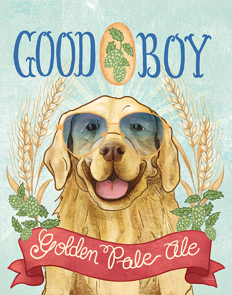 Brighten up your living space with this charming and whimsical art print that blends a love for furry friends with the delightful spirit of craft brews. Our "Good Boy Golden Pale Ale" art print is a must-have for any dog lover or craft beer aficionado looking to add a playful touch to their wall decor collection. Featuring an adorable golden retriever adorned with a pair of classic aviator sunglasses, this captivating piece sets a joyful tone in any room. The detailed illustration showcases sprigs of hops and barley, adding a subtle nod to the beer theme, while a vintage-inspired banner reads "Golden Pale Ale," completing the design with a rustic flair. Crafted with attention to detail, the art print boasts a soft pastel blue background that complements the warm golden tones of the retriever's fur, making it a versatile addition to both modern and traditional decors. Whether it's displayed in your home bar, kitchen, or living room, it's sure to spark conversations and bring smiles. This delightful print not only serves as a cute and quirky wall decoration but also as an ode to man's best friend and the art of brewing. Its unique style makes it an excellent gift for pet lovers, homebrewers, or anyone looking to enhance their interior with a touch of whimsy and charm. Elevate your wall art collection with this endearing "Good Boy Golden Pale Ale" print, and infuse your home with personality, comfort, and a splash of playful character.For more art by Mary Urban click here.
