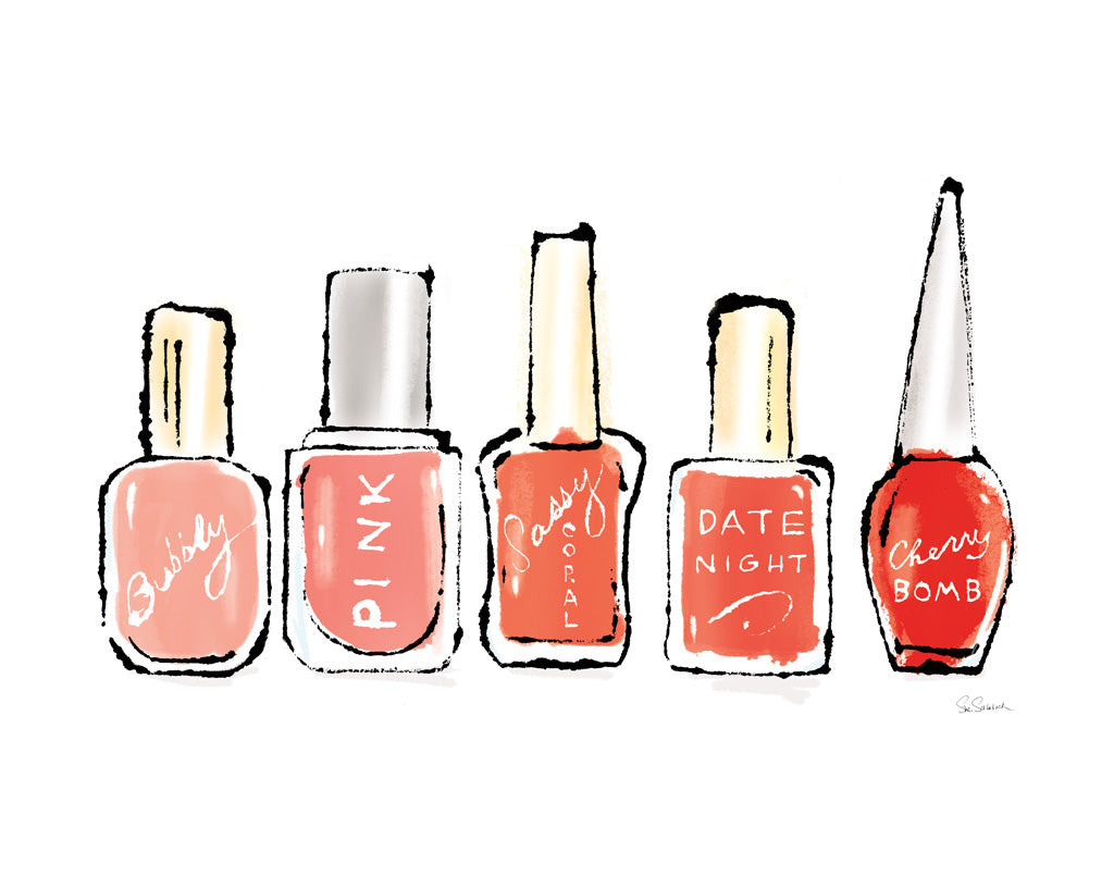 Brighten up your space with this charming and fashionable nail polish art print, the perfect addition to any beauty enthusiast's wall decor collection. This delightful illustration showcases a series of chic nail polish bottles in an array of playful shades, including soft blush, vibrant coral, and bold red, each whimsically labeled with fun names like "Bubbly," "PINK," "Sassy Coral," "DATE NIGHT," and "Cherry Bomb." Crafted with a keen eye for style and a splash of whimsy, this art print adds a touch of glam and personality to your bedroom, dressing room, or beauty salon. The minimalistic yet expressive design is versatile, making it an ideal complement to both modern and retro aesthetics. Ready to frame and hang, this high-quality art print serves as a daily reminder to embrace life's colorful moments and is perfect for gifting to the fashion-forward individual in your life. Elevate your home or office wall art with this playful and trendy statement piece, and let your interior design speak volumes about your love for beauty and vibrance.For more art by Sue Schlabach click here.