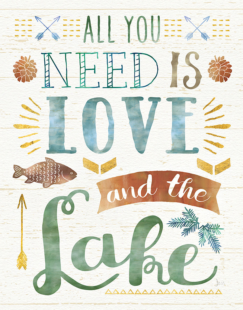 Elevate the ambiance of your living space with this charming and inspirational "All You Need Is Love and the Lake" art print. An ideal integration of serene style and heartfelt emotion, this print features a harmonious blend of nature-inspired motifs and whimsical typography in a watercolor texture that exudes tranquility. Pine cones, fish, arrows, and evergreen sprigs come together in a cohesive and visually appealing design that celebrates the simplicity of lakeside living. Crafted with care, the text "All You Need Is Love" dominates the top in varying hues of green and blue, emphasizing the universal message of affection. Below, in a warm earthy banner, "and the Lake" completes this idyllic expression, making it a perfect addition to your gallery wall or a standalone statement piece. Whether you're looking to complement your cottage decor, spruce up a cozy corner in your home, or find that thoughtful gift for a lake-loving friend, this art print delivers a touch of heartfelt warmth to any wall in need of love and nature's peaceful touch.For more art by Jess Aiken click here.
