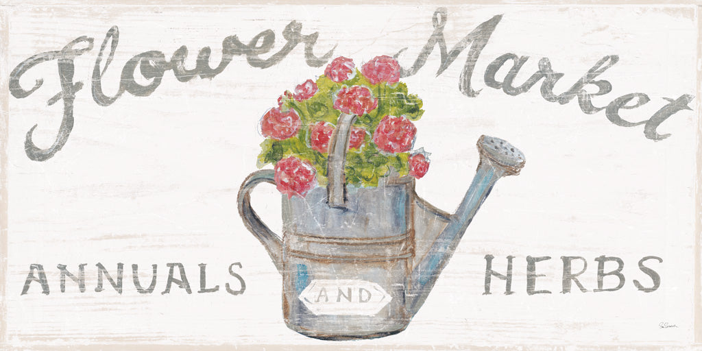 Elevate your home's aesthetic with our charming "Flower Market" art print, an elegant piece that combines rustic allure and floricultural charm. Perfect for those who appreciate a touch of vintage whimsy, this artwork features a beautiful, distressed-style depiction of an old-fashioned watering can filled with lush, red annual flowers. The backdrop, a wooden texture with soft brush strokes, enhances the homey, welcoming vibe. Text elements reading "Flower Market," "Annuals," and "Herbs" are artfully integrated, creating a quaint farmer's market sign look that's ideal for kitchen wall decor, living room accents, or even adding a cozy ambiance to your dining area. This print is a lovely addition to any interior that treasures garden-inspired motifs and country-style decor. The neutral color palette ensures that this wall art blends harmoniously with a wide range of home decor styles, from shabby chic to modern farmhouse. Printed on high-quality materials with attention to detail, this art print serves as an eye-catching wall decor element that invites conversation and brings a breath of fresh air to any living space. Whether you're looking to enhance your wall decor collection or searching for the perfect gift for the plant enthusiast in your life, our "Flower Market" art print is a timeless choice that will keep your walls blooming with style all year round.For more art by Sue Schlabach click here.