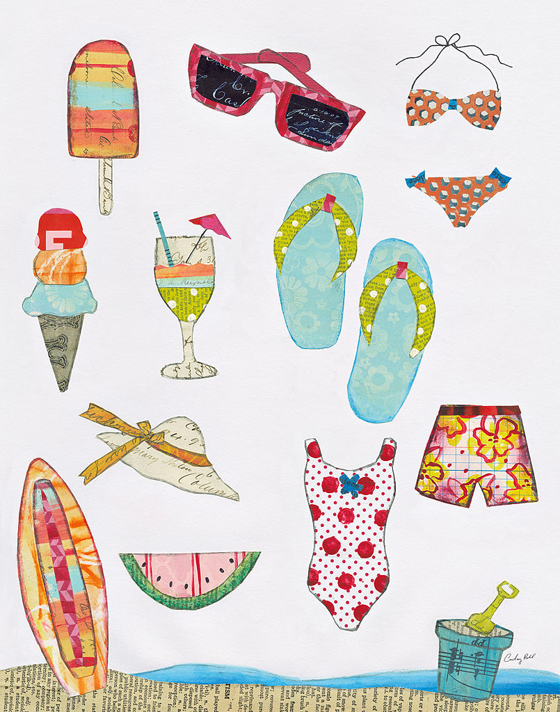 Elevate your home with a touch of summer whimsy using this delightful 'Beach Vibes' art print, a perfect addition to your wall decor collection. This vibrant piece showcases a playful array of beach-themed illustrations, including colorful ice creams, a pair of chic sunglasses, an adorable two-piece swimsuit, flip-flops with a floral design, a refreshing cocktail, stylish board shorts, a vintage surfboard, a cute one-piece polka dot swimsuit, a slice of watermelon, and a whimsical ice bucket with a bottle. Set against a textured background that hints at sandy shores and sunny days, each element is depicted with charming patterns and cheerful colors that are sure to brighten any room. Ideal for those looking to enhance their living space, beach house, or even office with a splash of coastal charm, this art print is a fantastic choice for interior design enthusiasts, offering a blend of fashionable aesthetics and summery motifs. It makes for a thoughtful gift or a splendid treat for yourself, especially if you're a fan of summer, beaches, and light-hearted art. Whether placed in a minimalist frame to complement its clean lines or a more decorative one to add an extra pop, this piece will undoubtedly become a talking point and a source of joy. Add this delightful summer-themed artwork to your curated gallery wall or let it stand out as a solo piece, and enjoy the perennial sunshine it brings to your decor.For more art by Courtney Prahl click here.