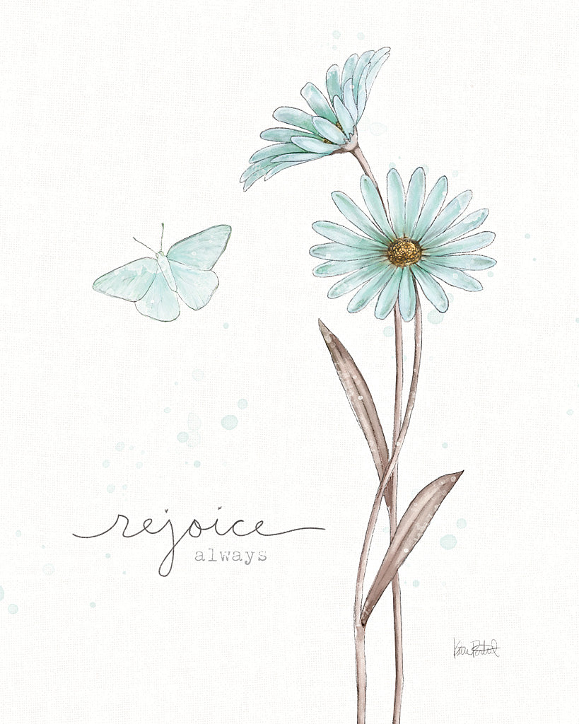 Brighten your living space with this enchanting art print featuring a delicate illustration of pale aqua daisies and a gentle butterfly, gracefully accompanied by the inspiring text "rejoice always." This serene botanical artwork merges the beauty of nature with a touch of whimsical charm, making it an ideal addition to your wall decor collection. Perfect for anyone seeking to create a tranquil, uplifting atmosphere in their home, this print will infuse any room with a sense of peace and joy. With its subtle color palette and elegant design, it's a versatile piece that suits a variety of interior styles, from contemporary to country chic. Whether you're looking to adorn your living room, bedroom, or office, this art print provides a daily reminder to rejoice in life's simple pleasures, making it not just a decor element but an invitation to embrace positivity.For more art by Katie Pertiet click here.