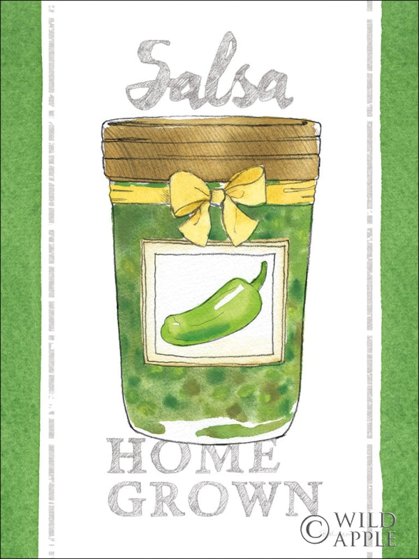 Add a dash of rustic charm and personality to your kitchen or dining room with this delightful "Salsa Homegrown" art print. Featuring a whimsically illustrated green jar, adorned with a playful yellow bow and boasting a watercolor-style jalapeño pepper, this piece exudes a homey, farmhouse vibe. The word "Salsa" is elegantly scripted atop, while "Home Grown" anchors the image, suggesting a celebration of garden-fresh produce and homemade culinary creations. Perfect for foodies, home chefs, or anyone who appreciates country-inspired wall decor, this art print infuses warmth into any space. Ideal for adding to a gallery wall or as a stand-alone statement piece, it's sure to become a conversation starter. Embrace the beauty of handcrafted charm and make this kitchen art print a staple in your wall decor collection.For more art by Beth Grove click here.