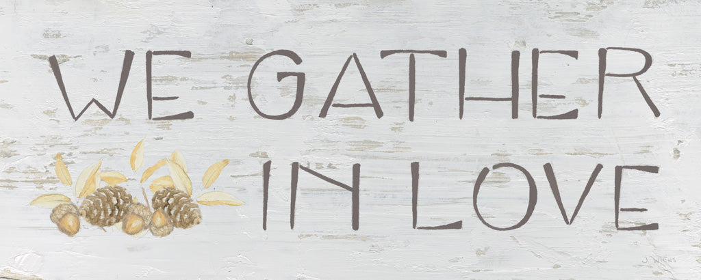 Elevate your home's ambiance with this charming and serene art print that beautifully blends rustic charm with a heartwarming message. This high-quality wall art features the phrase "We Gather in Love," gracefully hand-painted in stylish, earthy tones that evoke a sense of warmth and togetherness. Above the welcoming phrase, an illustration of acorns and leaves adds an element of nature's tranquility to the design, making it a perfect addition to your farmhouse decor or country-style living space. Crafted with exquisite attention to detail, the textured white background reveals subtle hints of distressing, giving this piece an authentic feel of aged wood that adds depth and character to your wall decor collection. This blend of contemporary typography and classic imagery creates a versatile piece that will complement a variety of interior design themes from rustic to modern minimalist. Whether you're looking to adorn your living room, kitchen, or dining area, this inspirational art print serves as a reminder of the love that gathers in your home. Its gentle color palette allows for easy integration into your existing decor, ensuring it will be a focal point in any room. Ideal for those searching for unique housewarming gifts, thoughtful wedding presents, or simply seeking to infuse their own space with a touch of elegance and warmth, this wall art is a timeless investment for those who cherish love and family gatherings. Enhance your collection of wall decor with this exquisite art print that captures the essence of home and heart.For more art by James Wiens click here.