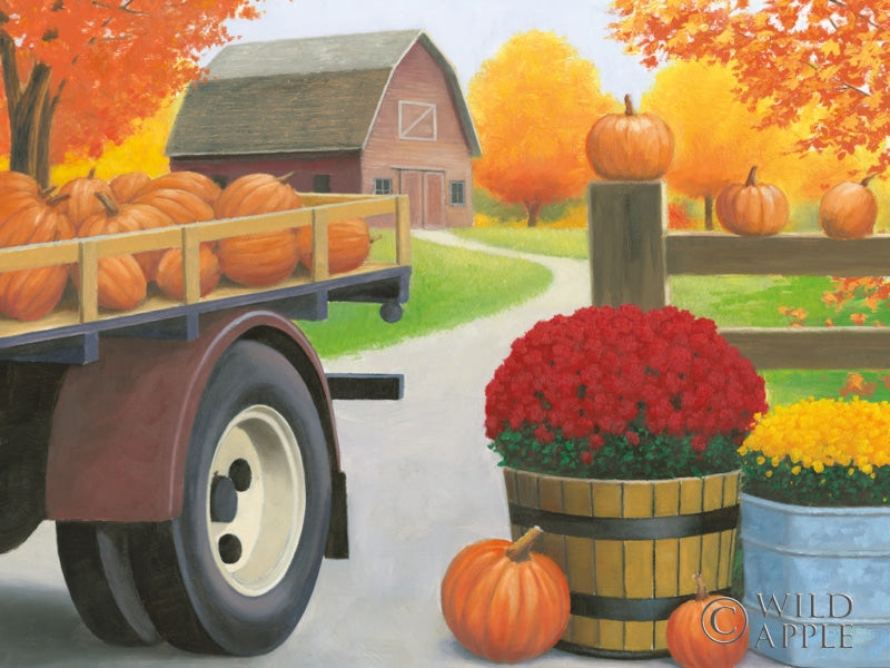 Embrace the essence of autumn with our enchanting rustic barn and pumpkin art print, a perfect addition to your seasonal wall decor collection. This charming piece captures the heartwarming tranquility of fall, featuring a picturesque scene of a country farm. The center of the artwork presents a vibrant, color-rich landscape with a classic red barn surrounded by trees adorned in autumn's signature fiery hues. In the foreground, an old-fashioned wagon brims with a bounty of beautifully rendered pumpkins, ready for harvest festivities. Accompanying the wagon, a wooden bucket and a metal pail overflow with brilliant red and yellow mums, symbolizing the richness and warmth of the season. This art print is ideal for creating a cozy atmosphere in your living room, kitchen, or dining area, and makes for an exquisite focal point in any space that celebrates the rustic charm and the natural beauty of the countryside. The subtle play of light and texture brings depth to this tranquil farm setting, inviting viewers to immerse themselves in the serene beauty of the fall season. Designed to complement a variety of home decor styles, from farmhouse chic to modern country, this art print is available in multiple sizes to fit your space perfectly. Whether you're looking to enhance your seasonal decor or searching for a timeless piece to enjoy year-round, this rustic barn and pumpkin art print is a delightful choice that will bring a touch of harvest joy to your walls.For more art by James Wiens click here.