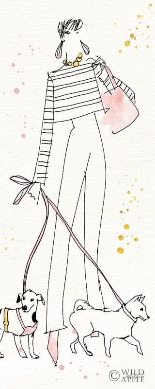 Brighten up your living space with the charm and whimsy of this chic art print, a must-have addition for any contemporary wall decor enthusiast. The print features an elegantly illustrated woman in a fashionable striped outfit, adorned with playful accessories, taking a leisurely walk with her two adorable dogs. This artwork captures a delightful moment of everyday joy, adding a touch of style and personality to any room. The minimalist design blends ink sketch aesthetics with delicate watercolor elements, incorporating splashes of pink and gold that give off a trendy, yet timeless vibe. Perfect for modern urban interiors, stylish home offices, or cozy reading nooks, this art print makes for an excellent gift for fashion lovers, pet owners, or anyone who appreciates the beauty of subtle artistry. Crafted on high-quality paper and available in various sizes, this print is tailor-made for those looking to enhance their home decor with art that combines modern elegance with a dash of fun. Whether it's a single statement piece or part of a curated gallery wall, this unique illustration promises to infuse your walls with life and conversation.For more art by Anne Tavoletti click here.
