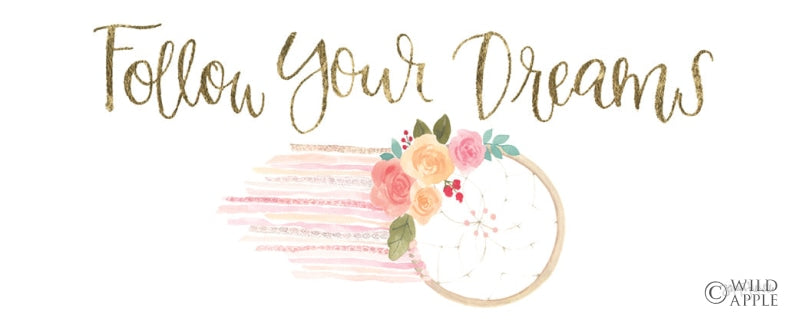 Elevate your home decor with this elegant and inspirational "Follow Your Dreams" art print, a perfect addition to any room seeking a touch of whimsy and motivation. This charming wall art features beautifully scripted gold foil typography set against a soft, pastel-hued background, accompanied by a delicate bouquet of blush and coral roses arranged alongside a dreamcatcher. The gentle strokes of pink brushstrokes add a contemporary touch to the piece, making it an ideal choice for those who love modern farmhouse aesthetics or shabby chic styles. Whether adorning your home office, creating a serene atmosphere in your bedroom, or adding a dose of positivity to your living space, this high-quality print is sure to inspire and enchant. Bring this blend of floral beauty and uplifting words into your home to remind you daily of the power of following your dreams.For more art by Jenaya Jackson click here.